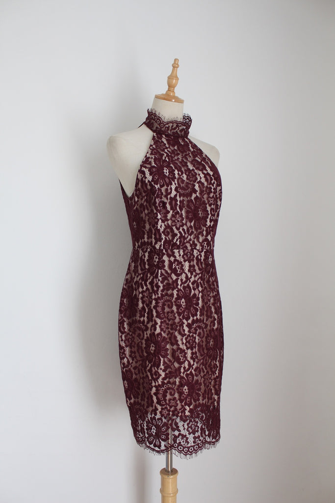 Stylish Keepsake red lace overlay high neck cocktail dress. Lined.