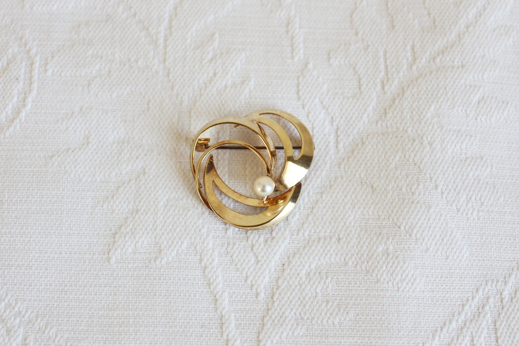 Classic authentic vintage rolled gold (plated) brooch with freshwater pearl embellishment. Stamped RG.