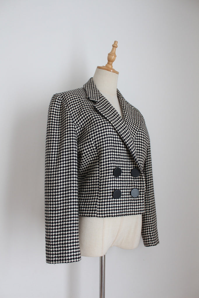 Authentic vintage Maxi Librati Paris designer houndstooth cropped jacket in black and cream. Fully lined. Made in France.