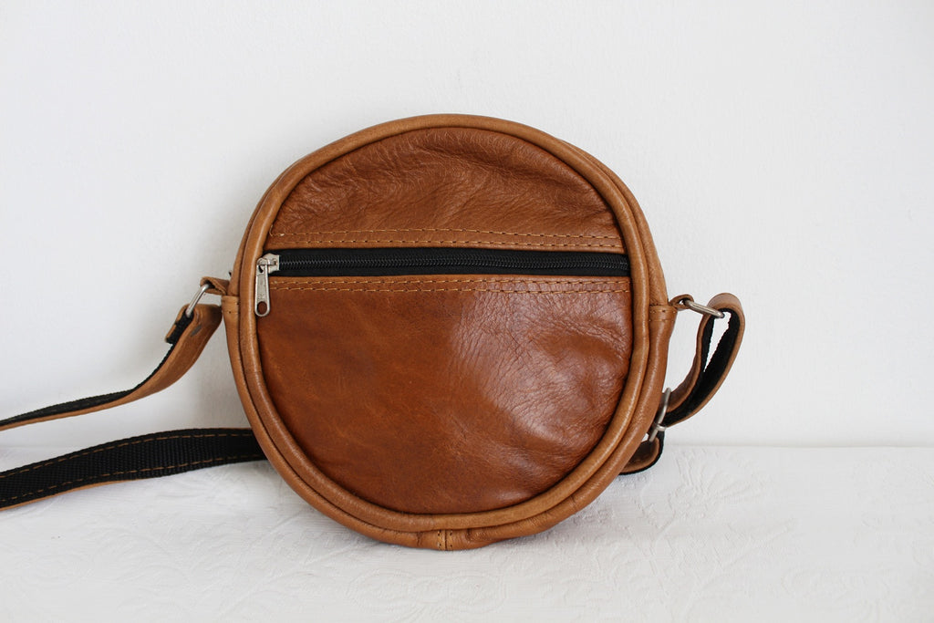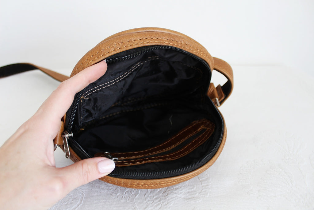 NEW GENUINE LEATHER ROUND SLING BAG TAN