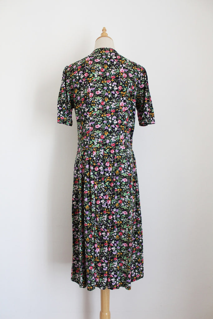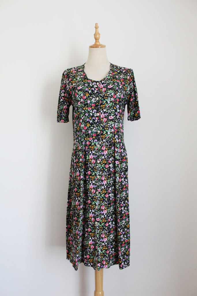 VINTAGE CHINTZ PRINT BUTTON DOWN DRESS BLACK - SIZE 8