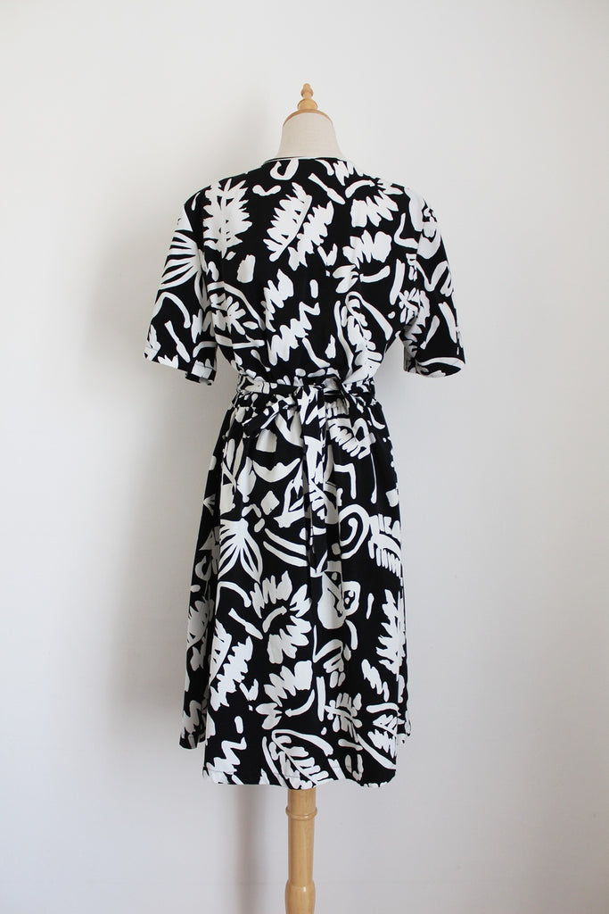 VINTAGE LEAF PRINT WRAP DRESS BLACK WHITE - SIZE 16