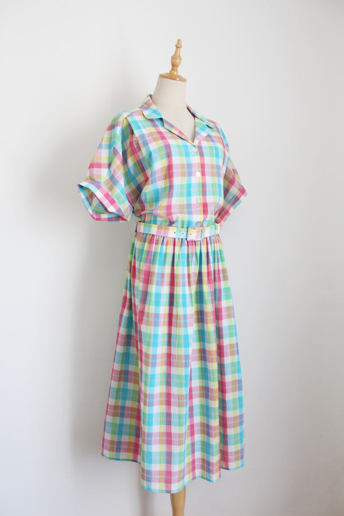 Summer ready authentic vintage pastel plaid belted day dress. Elasticated at waist.