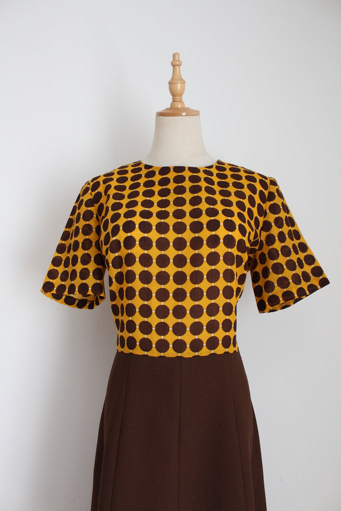 VINTAGE POLKA DOT DRESS BROWN YELLOW - SIZE 10