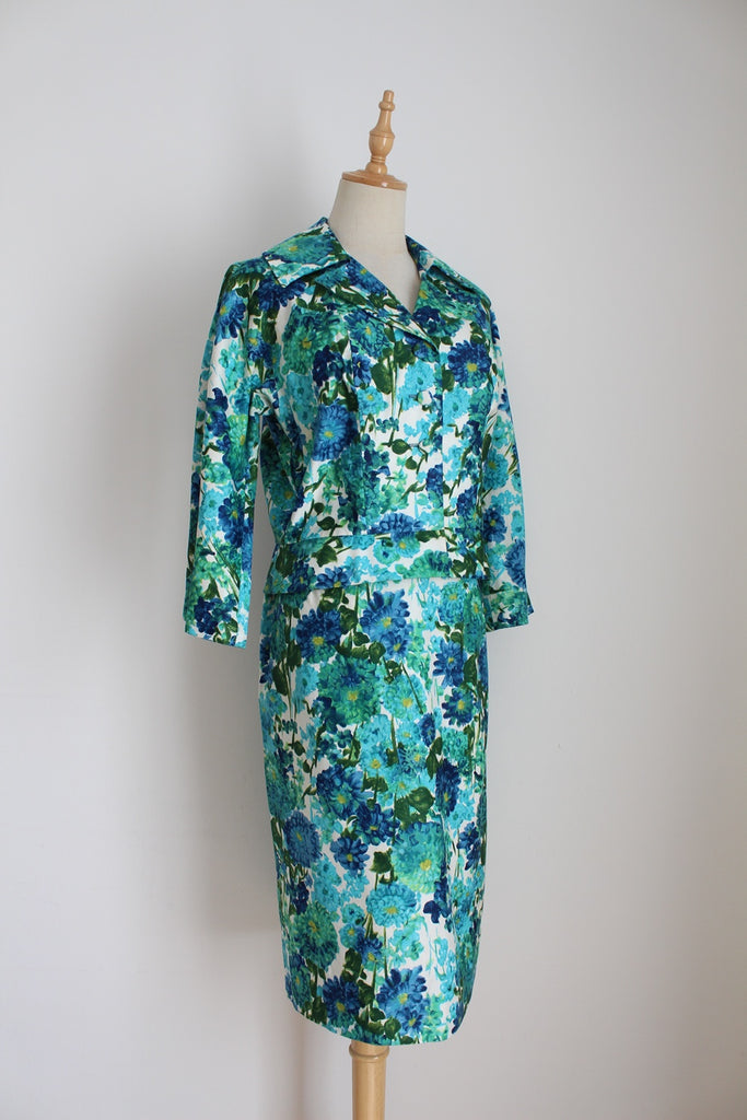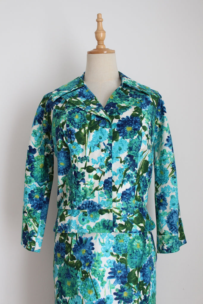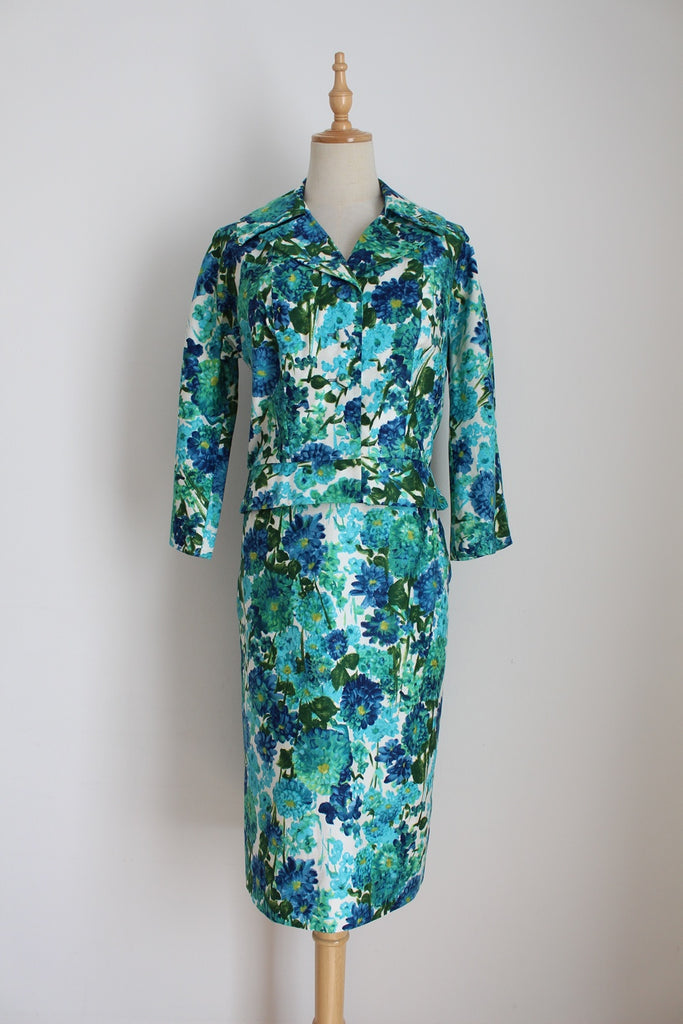 Beautiful authentic vintage blue/ green floral print two piece jacket and pencil skirt set. Unlined.