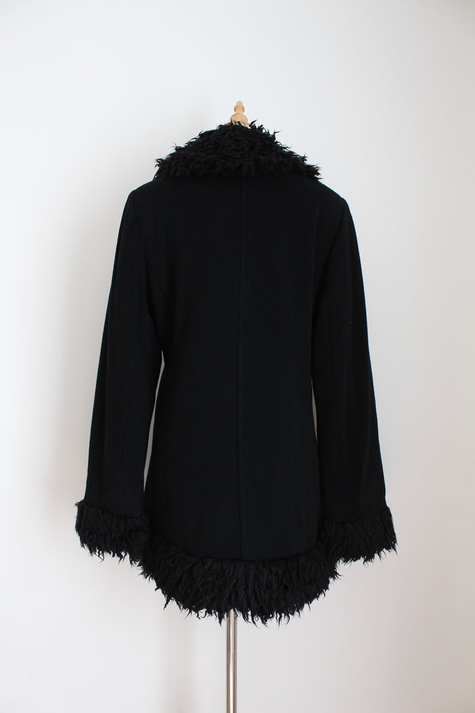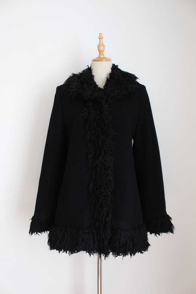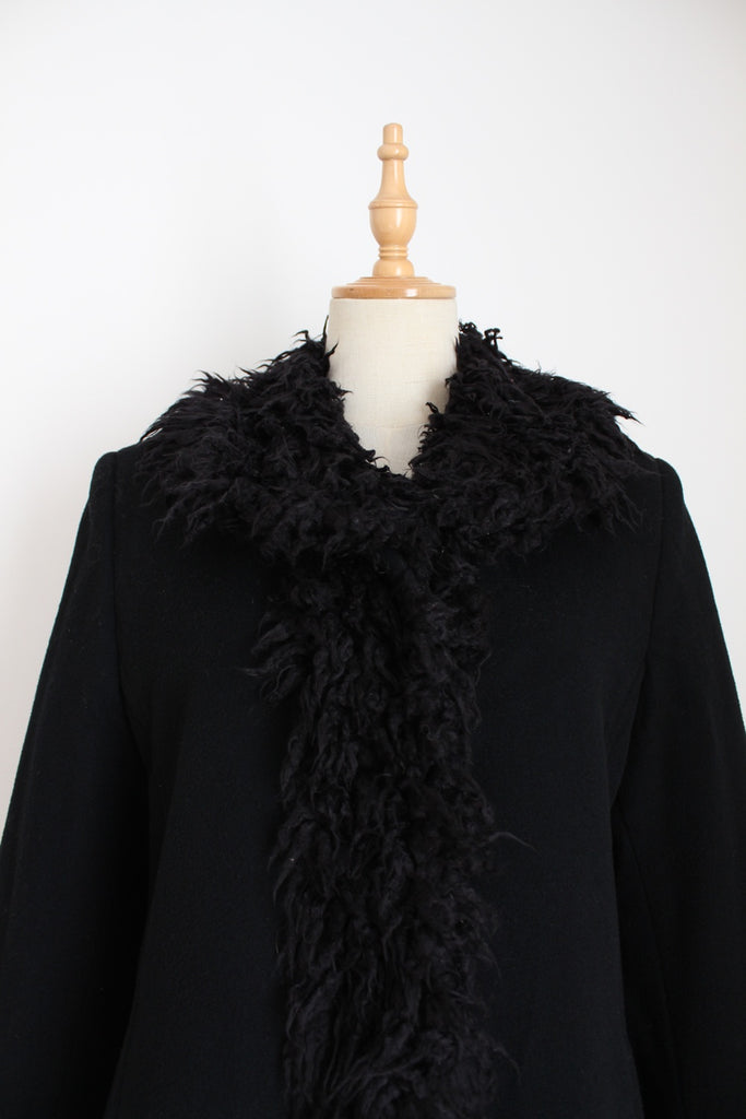 Stunning authentic vintage wool and cashmere black coat with faux fur trim. Woven in Italy.